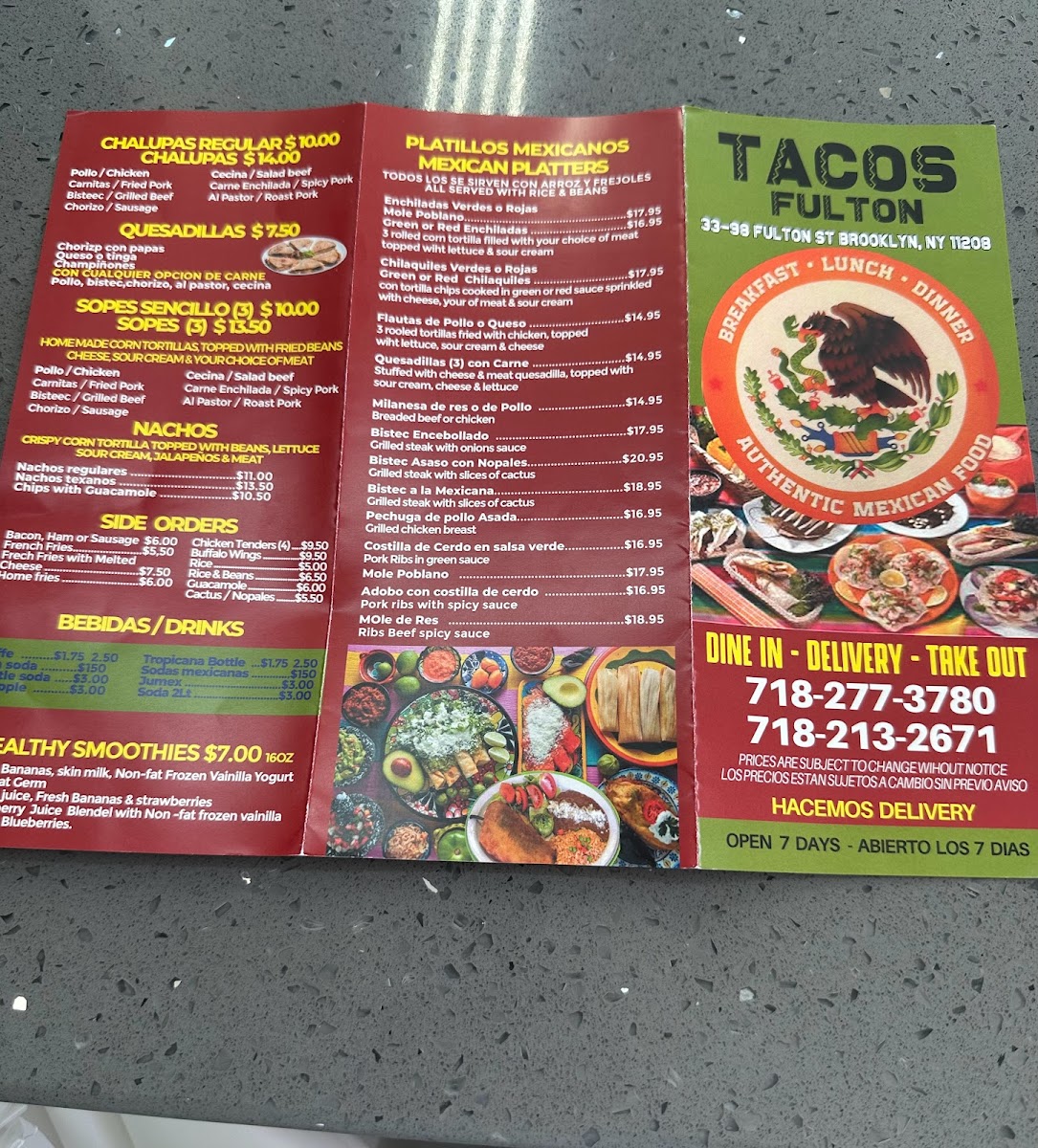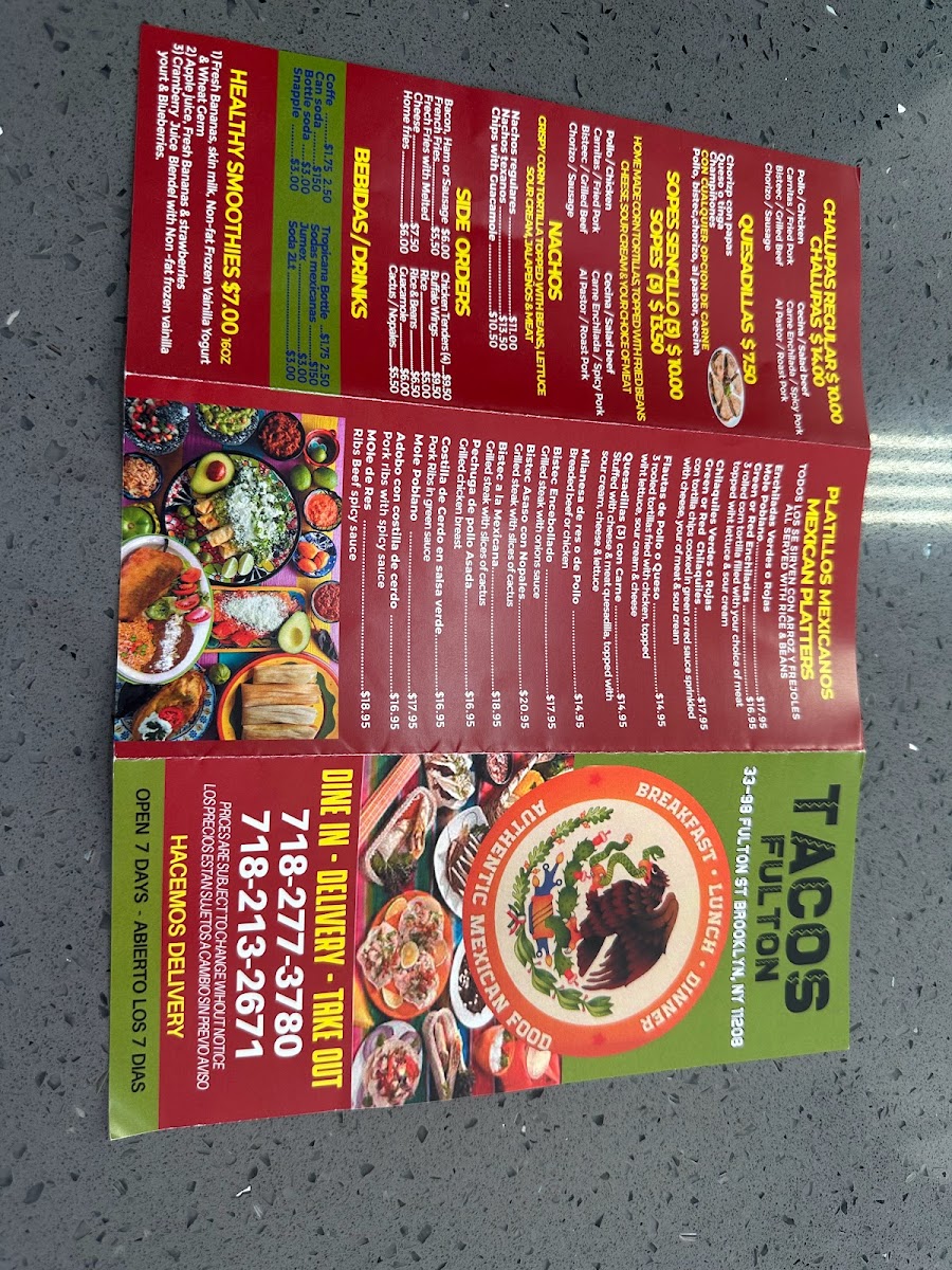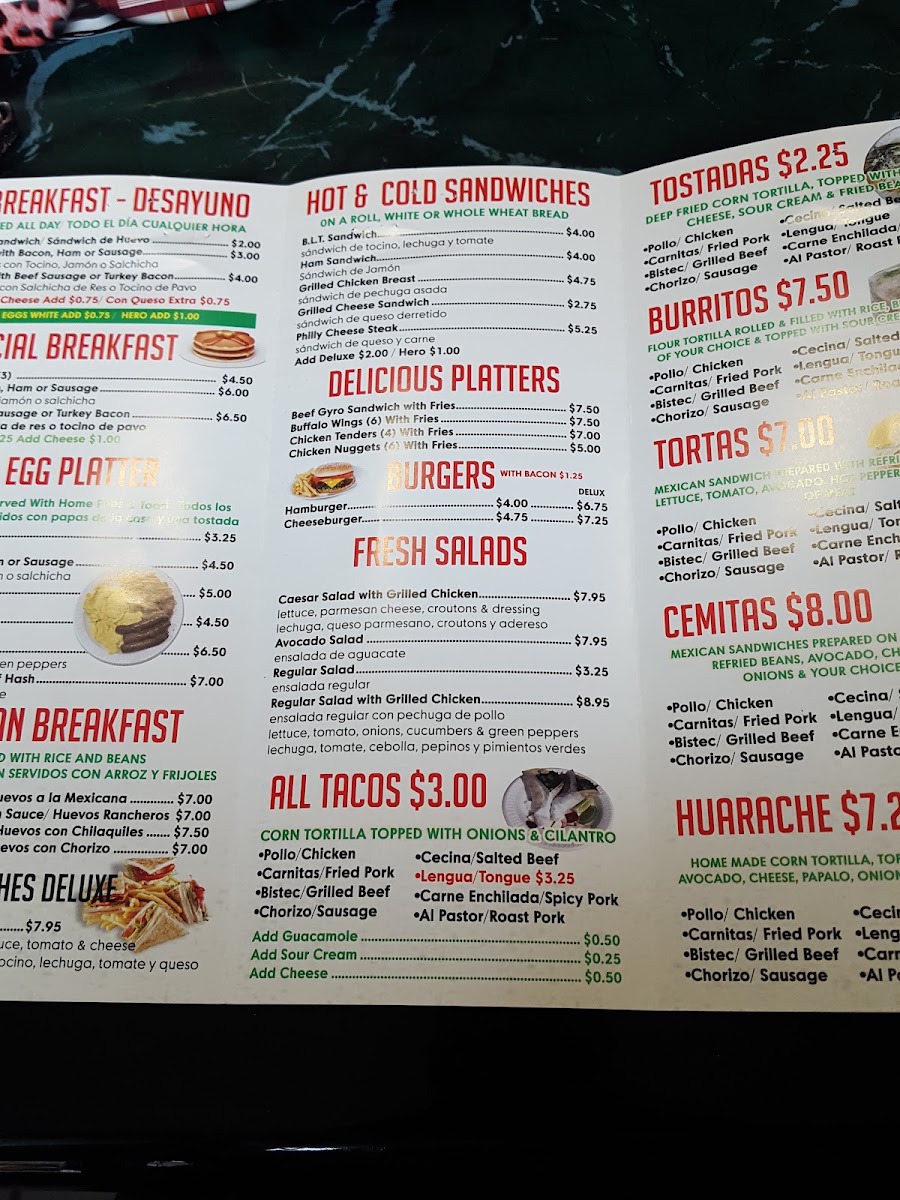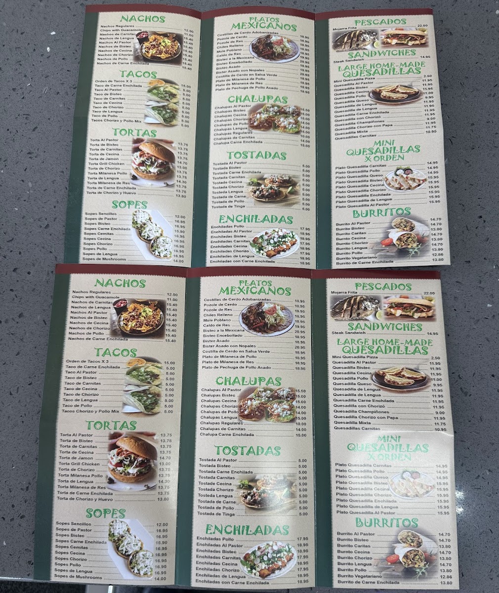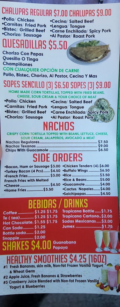 Your choice of red or green sauce topped with chopped onion, Cotija cheese and meat of your choice. Choose a meat: Pollo (Chicken), Carnitas (Fried Pork), Chorizo (Sausage), Lengua (Tongue), Carne Enchilada (Spicy Pork).